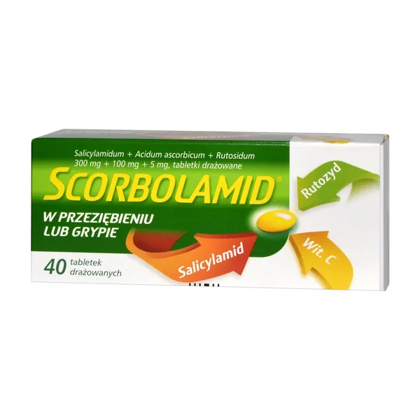 Scorbolamid to produkt leczniczy w postaci tabletek stosowany w objawach związanych z przeziębieniem lub grypą, takich jak gorączka i ból może być również stosowany w nerwobólach i bólach głowy. Zawiera dodatkowo rutozyd i witaminę C działające wzmacniająco na naczynia krwionośne i wspomagające układ odpornościowy w walce z chorobą.